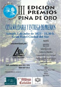 La fundación Asprodeme retoma sus actos benéficos después de la Pandemia, este año 2023 se celebrará la III edición de la cena solidaria donde se  hará entrega de la piña de oro, que se otorgará a personas, empresas o instituciones que se han distinguido por su apoyo a colectivos de discapacitados psíquicos.